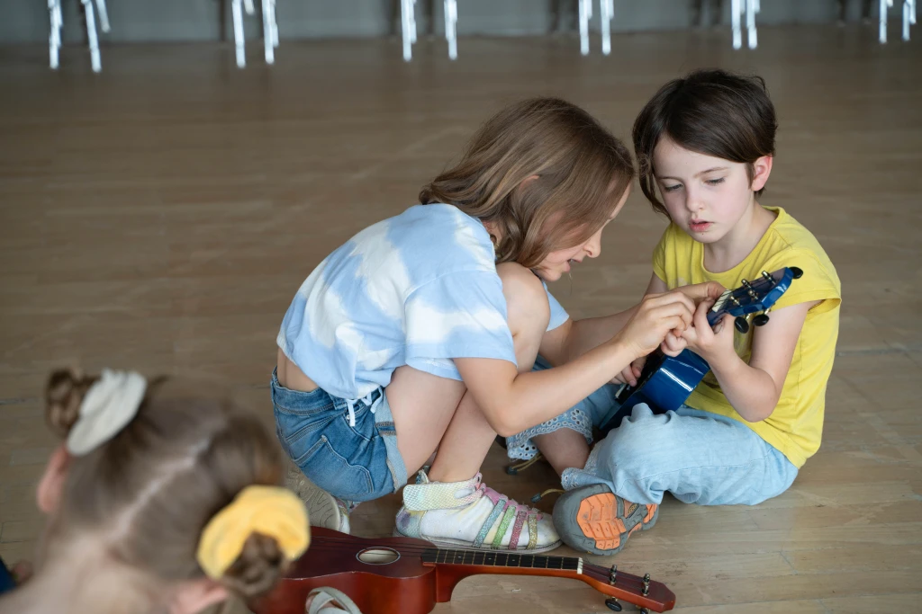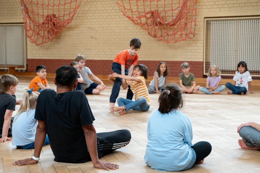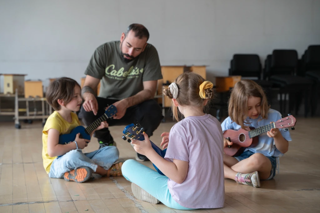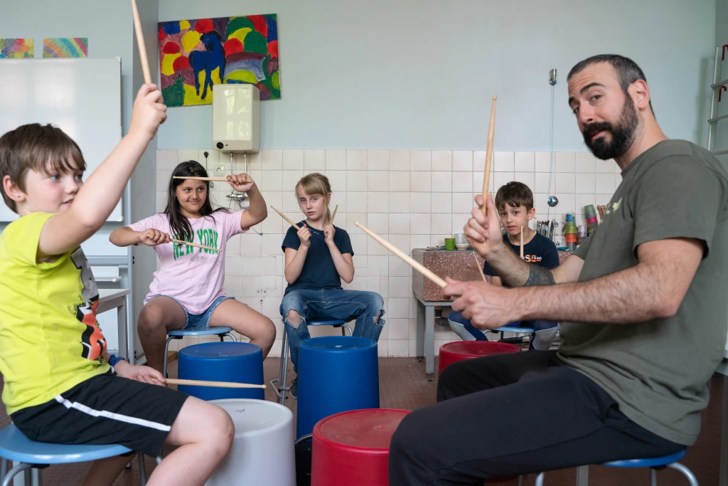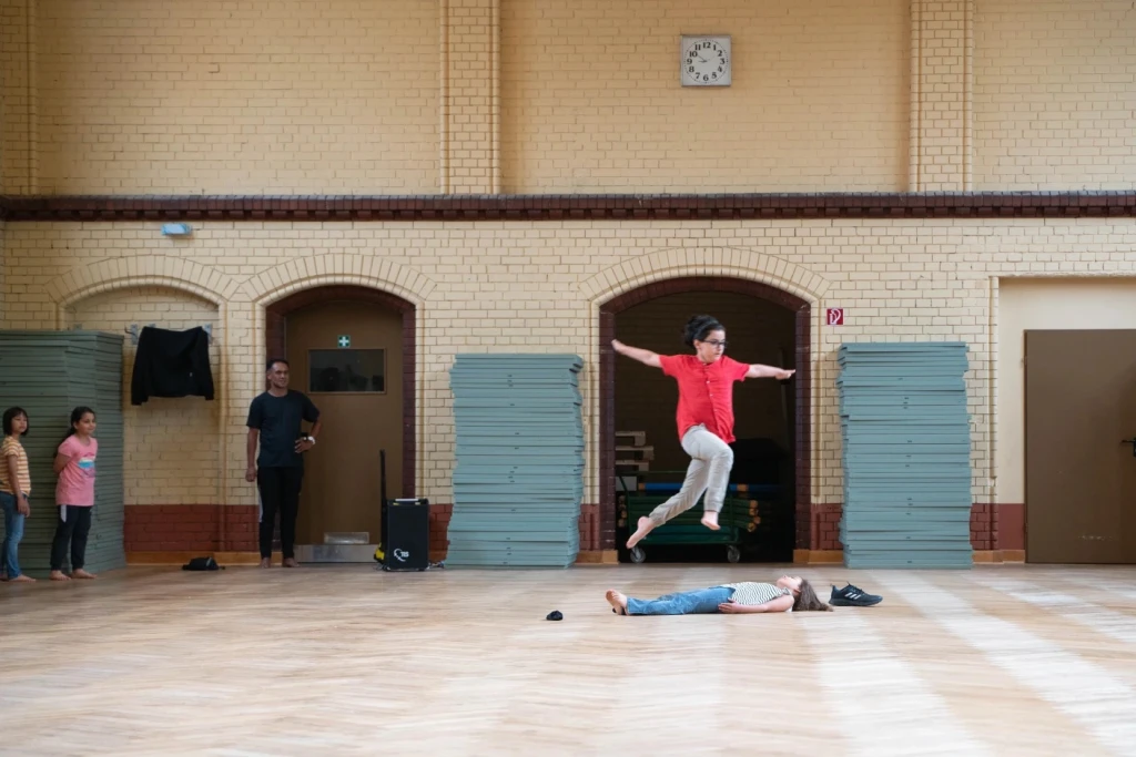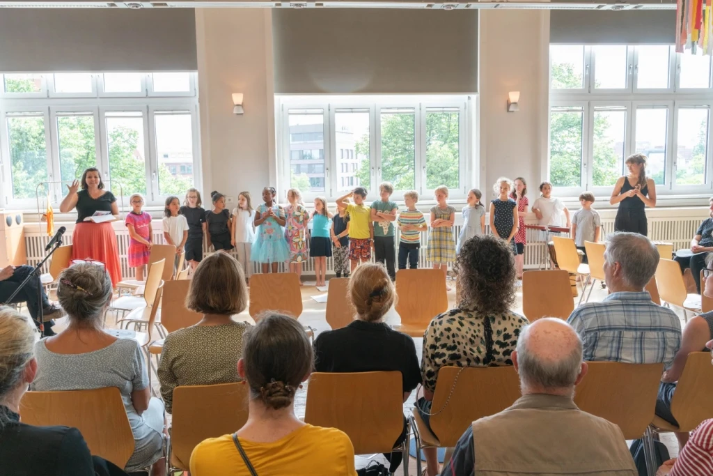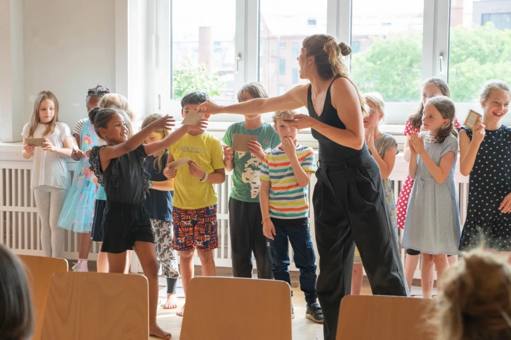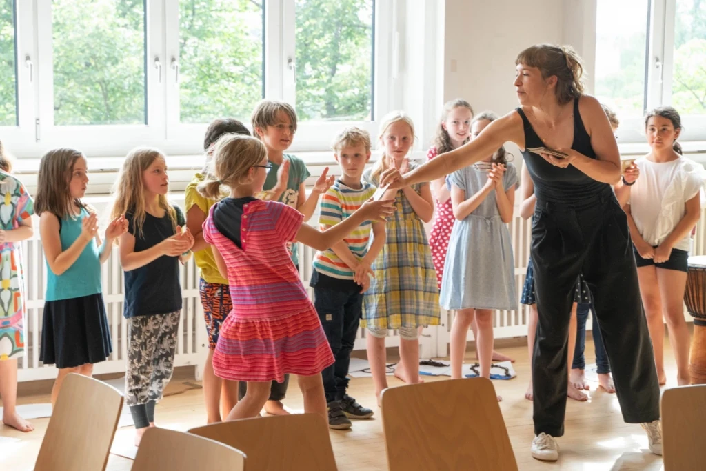 Eine Musik-/Theaterpädagogin der Musikschule Fanny-Hensel leitet Schüler:innen der 3. Jahrgangsstufe in Musik und im Schauspiel an.