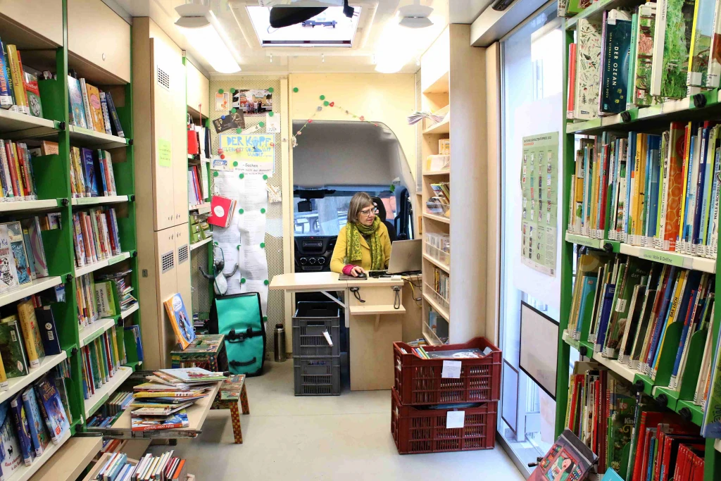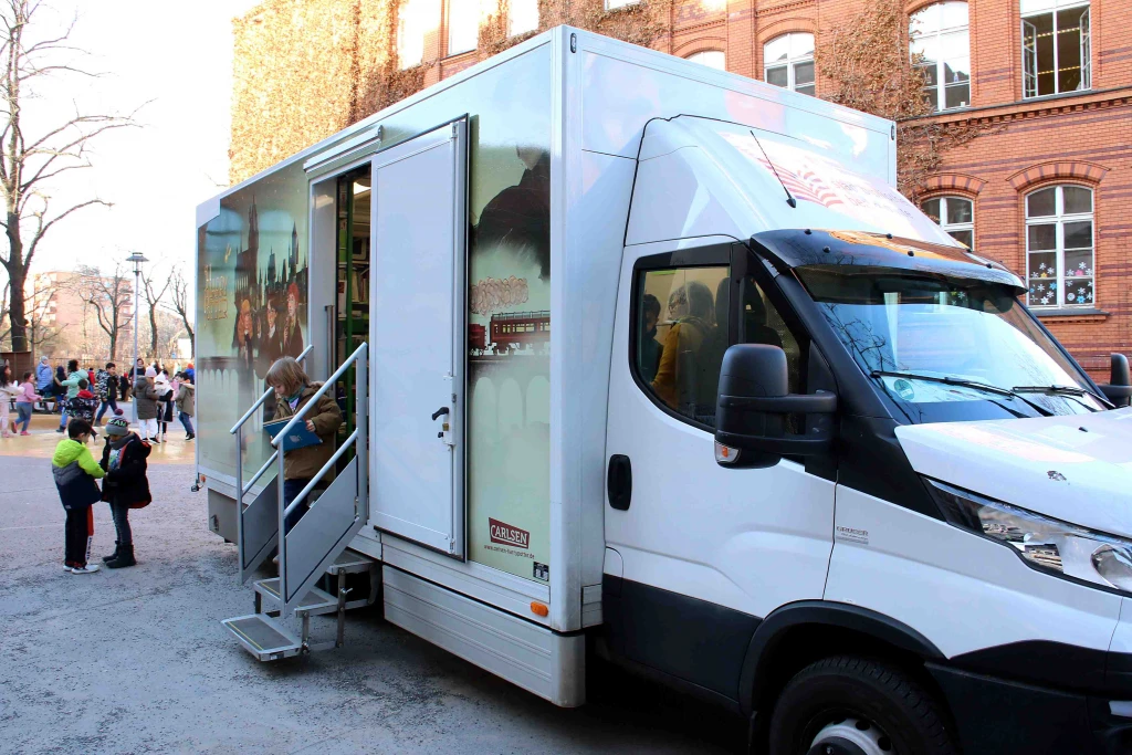 Die Fahrbibliothek Berlin-Mitte steht mit Bus 3 jeden Montag in der Zeit von 9.00 Uhr bis 11.45 Uhr für die Kinder und das pädagogische Personal auf dem Schulhof.