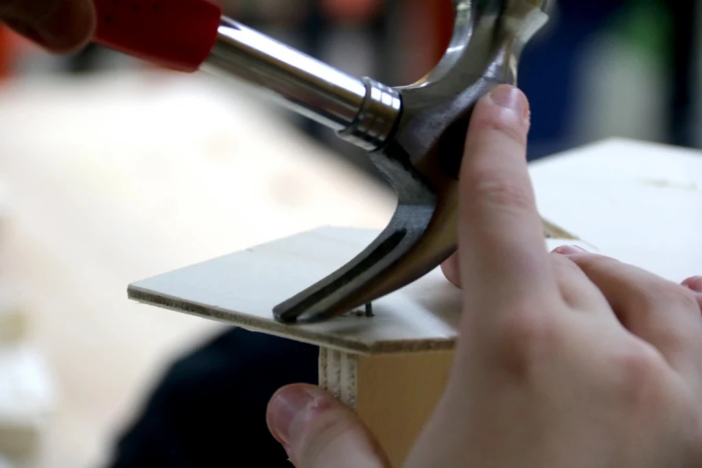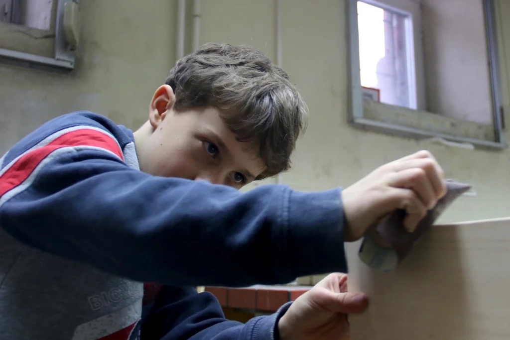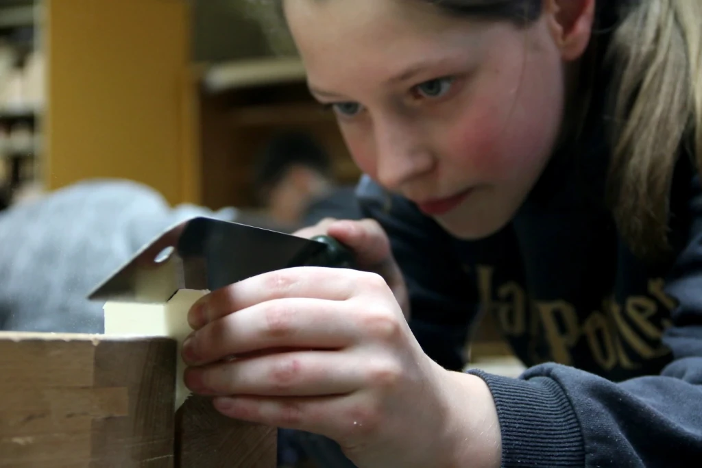 Mit viel Freude schleifen, bohren, hämmern, sägen und feilen die Kinder, bis ihr eigenes Produkt, wie zum Beispiel ein Reisespiel, ein Schreibtischregal, ein Bumerang oder ähnliches entstanden ist.