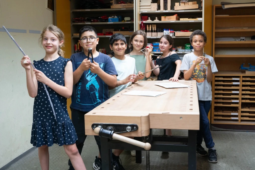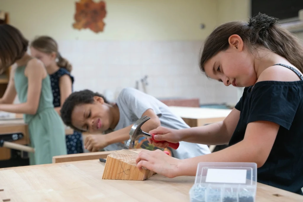 Hier erlernen die Kinder den sicheren Umgang mit Holz und können so ihre Interessen und Kompetenzen auf vielfältige Art und Weise erweitern.